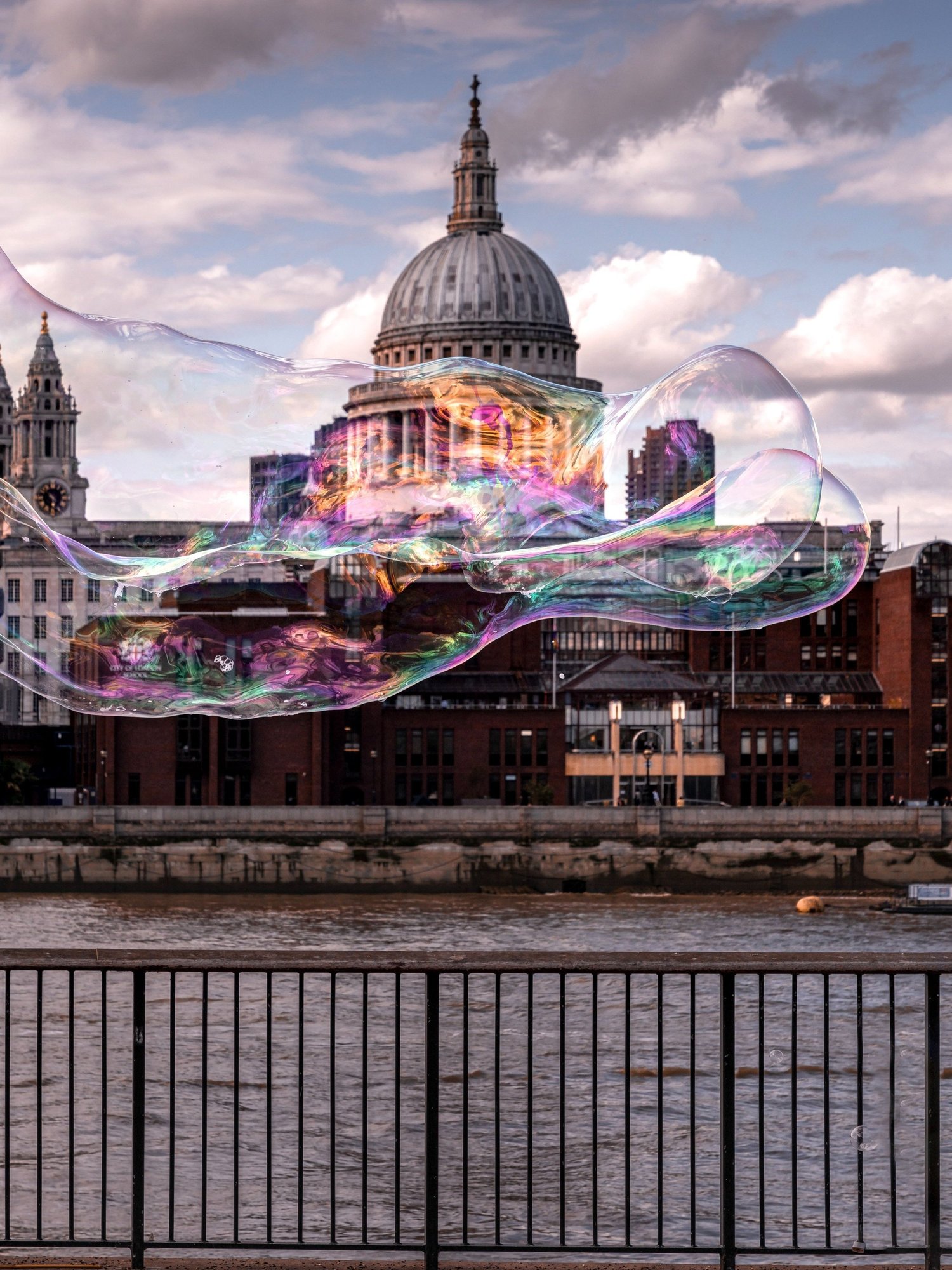 A street performer blowing giant bubbles lead to this spectacular street shot of St. Pauls surrounded by a giant bubble, causing the colours of the bubble and the architecture of the cathedral to merge into one.
